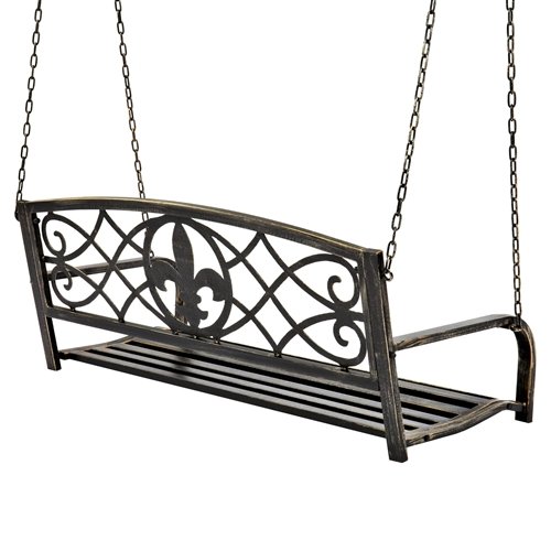 Swing in style with the Farm Home Bronze Sturdy 2 Seat Porch Swing Bench Scroll Accents. Crafted with a sleek, rustic design sure to blend well with your home's porch or patio decor. This classic, eye-catching swing bench boasts a fleur-de-lis design in the center of its back for a touch of refined beauty.Lounge outside for some you time or hang out with a friend, as the bench can easily seat 2 people. Made of heavy-duty metal, this bench withstands the elements to resist rust buildup and last through the years.