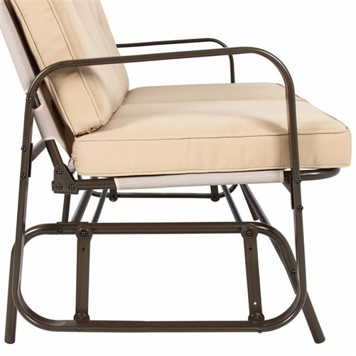 Quarantine at home in style with the UV-Resistant Beige 2 Seater Ergo Patio Glider Loveseat Rocking Chair Bench! Inviting bench complements any outdoor setting and glides smoothly, making it a relaxing lounging essential for you and a friend. Built with ergonomic armrests, and soft seat and backrest cushions conform to your body to provide a bench worth sinking into for hours of relaxation. Made to withstand outdoor conditions, the glider's cushions are made with water-resistant polyester fabric for easy cleaning. Feel confident in knowing the bench glides back and forth on a strong, sturdy frame built to hold up for years to come.